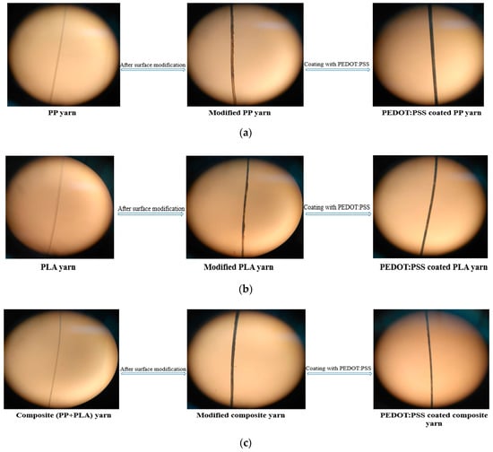 Optical microscopy images were used to analyze the coating thickness of the PP, PLA and PP/PLA yarns at different stages to analyze the changes of coating thickness of PP, PLA and PP/PLA yarns after PDA treatment and PEDOT:PSS coating. Optical microscope images captured of several single yarns in a original state before PDA treatment, after PDA treatment and PEDOT:PSS coating show that there are significant changes in the thickness of boundary layers shown in Figure 8. It is mentioned that an image of the all yarns at 100 times magnification was captured in all stages.