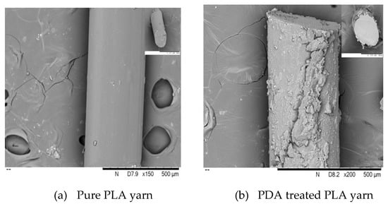 Figure 9b, Figure 10b, and Figure 11b revealed densely rough, more intact features and granular morphology of PDA treated PP, PLA and PP/PLA yarns. After surface modification of thermoplastic yarns by PDA, the results showed that the thickness of the modified PP, PLA and PP/PLA coating were 3.96 ± 1.45 µm, 3.52 ± 5.12 µm and 6.71 ± 3.9 µm respectively. Though PDA coating layer was observed over surfaces of PP, PLA and PP/PLA surface but it was not smooth and cracks are visible. However, still this roughness created a hydrophilic base for further coating and increased the tensile strength of yarns.