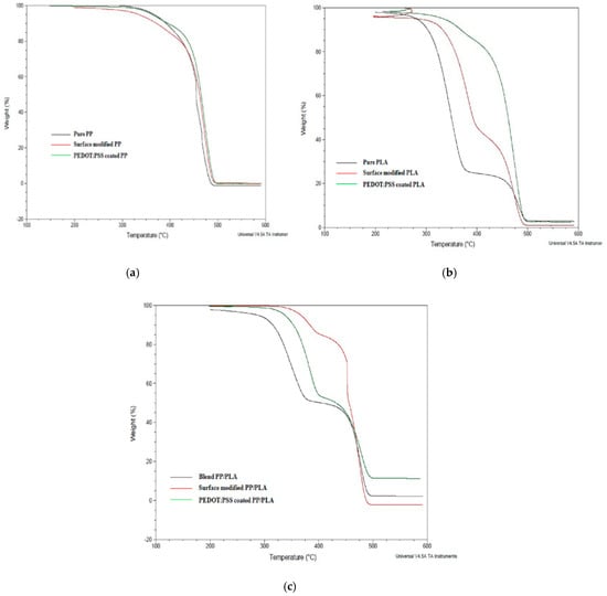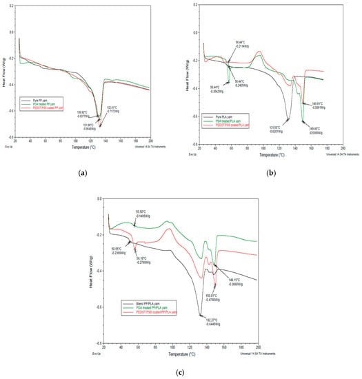 The Tg of the PLA remains same due to the reduction of the mobility of the amorphous character in the PLA polymer and the physical cross links with lower addition of PDA and PEDOT:PSS. A considerable increase is found in the Tm of PLA after PDA treatment and coating due to the physical crosslink with PLA polymer. From Figure 13c, it is seen that the glass transition temperature of blend PP/PLA polymer is 50.55 °C [64]. After polydopamine treatment and PEDOT:PSS coating, the glass transition temperature of blend PP/PLA polymers have increased at 55.50 °C and 56.18 °C respectively.