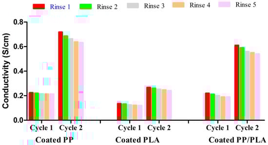 Conductive yarns must be sufficiently robust to be suitable for daily use particularly in respect of bending, abrasion, and cleaning. Wash durable conductive yarns production is a great technical challenge for repeat use. Conductive tracks typically cannot survive machine washing due to the mechanical stresses, reaction between detergent and water. The cleaning stability and washing performance of both PEDOT:PSS coated conductive yarns were analyzed. Figure 14 shows the relationship between electrical conductivity (S/cm) and rinsing cycles of PEDOT:PSS coated PP, PLA, and PP/PLA yarns after five rinsing cycles. Electrical conductivity of the conductive yarns was considerably decreased every after rinsing cycle.
