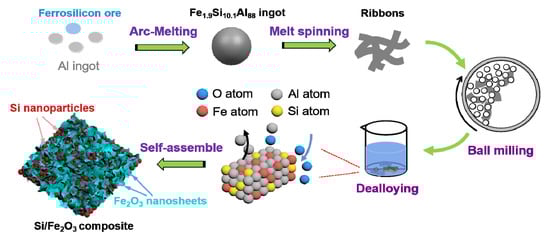 With the fast development of the market economy, the requirements for energy storage devices are constantly improving [1,2,3]. Lithium–ion batteries (LIBs) are identified as attractive energy maintaining devices because of their high specific energy, long service life and excellent environmental compatibility [4,5,6]. At present, the low theoretical capacity of the graphite anode restricts its commercial application in the high-end market [7,8]. To enhance the properties of LIBs further, it is necessary to develop new anodes with high performance. Silicon (Si) is considered to be one of the potential candidates to substitute conventional carbon anode for next-generation LIBs on account of the characteristics of extremely high theoretical mass-specific capacity (4200 mAh g−1), low working voltage and high natural abundance [9,10]. The main obstacle to its practical application is the tremendous volume variation (≈420%) during repeated lithiation/delithiation procedures [11], bring about pulverization, shedding of active materials and rapid decay of capacity [12,13,14]. To accommodate the volume variation of Si and boost the electrochemical properties of LIBs, some strategies have been proposed by scholars from various countries. Firstly, once the Si materials were produced into different nanomaterials, such as nanoparticles, nanotubes, nanowires, nano hollow structures and so on [15,16,17], they can provide shorter transmission paths and reduce the diffusion distance of Li+. Secondly, many Si nanostructures may provide sufficient space to suppress the volume variation and capacity attenuation [18,19,20]. At present, the traditional methods of preparing Si-based nanostructured materials mainly include chemical vapor deposition, high-temperature laser evaporation, self-assembly growth method and so on [21,22]. Furthermore, the formation of composites between Si and metal oxides (relatively low theoretical specific capacity) can also alleviate the volume change and structural damage of Si anodes to some extent, inducing an improvement in cycling stability [23]. David Zitoun et al. [24] synthesized Si/γ-Fe2O3 as an anode material for LIBs by successive organometallic decomposition of pentacarbonyl-iron on Si nanomaterials subsequently by redox reactions, demonstrating a high reversible capacity of 2600 mAh g−1; however, the above method seems difficult to satisfy the demands of industrial application because of its complex preparation process, strict preparation conditions and high cost both in materials and equipment.