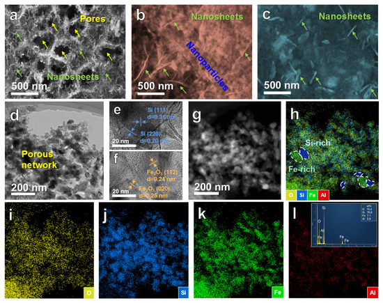 The microstructure of the optimal BM-48-4 sample was further analyzed by TEM. The interlacing distribution of nanoparticles and finely fragmented nanosheets demonstrates that the nanoporous structure is formed across the composite as shown in Figure 3d. The measured crystal interplanar distance of 0.31 and 0.20 nm shown in Figure 3e corresponds to (111) and (220) crystal planes of Si, respectively. While the interplanar distance of 0.24 and 0.25 nm marked in Figure 3f corresponds to (112) and (020) crystal planes of Fe2O3. These results indicate the co-presence of Si and Fe2O3, which are consistent with XRD results. The elemental mapping of BM-48-4 shown in Figure 3g–l reveals that Si, Fe, O and a small amount of residual Al elements were distributed in the sample. The energy dispersive X-ray (EDX) spectrum (the insert in Figure 3l) reveals that the atomic ratio of Si, Fe, Al and O is about 76.6:7.1:5.9:10.4. Si and Fe are enriched in different local areas (Figure 3h), which further confirms the formation of the dual network structure composed of the corresponding product of Si and Fe2O3.