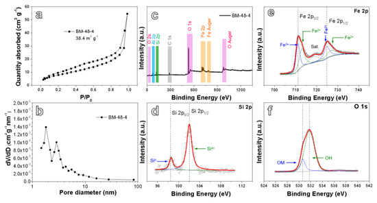 (a) N2 adsorption–desorption isotherm characteristics, (b) pore size distribution, (c) X-ray photoelectron spectroscopy (XPS) survey spectrum, and XPS spectra of (d) Si 2p, (e) Fe 2p and (f) O 1s for the BM-48-4.