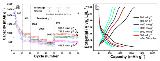 The rate performance of three electrode materials were tested at different current densities in the range of 200 to 5000 mA g−1, as presented in Figure 6a. The BM-48-4 electrode delivers the reversible capacity of 1356.5, 963.1, 779.9, 604.3 and 512.2 mAh g−1 under 200, 500, 1000, 2000 and 5000 mA g−1, respectively. At each current density, the BM-48-4 electrode shows the best specific capacity in the three anodes. When the current density recovers to 500 mA g−1, the BM-48-4 anode delivers a reversible capacity of 906 mAh g−1 after 30 cycles, which is extremely higher than the other two anodes, revealing a relatively good rate property of BM-48-4 in three electrodes. Figure 6b presents the charge and discharge curves of the BM-48-4 electrode at different current densities. It shows that with the enhancement in current density, the curve gradually shifts to the left, that is, the capacity of the electrode gradually reduces. Moreover, when the current density recovers from high current density to 500 mA g−1, the constant current charge/discharge profile almost coincides with the original curve tested at the same current density. All tests uncover that the BM-48-4 electrode possesses the best rate performance.