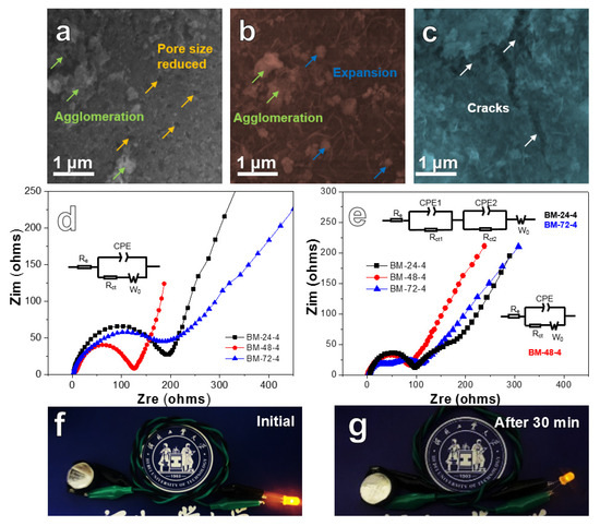 Figure 7a–c presents SEM images of three Si/Fe2O3 anodes after cycling at 200 mA g−1 for 100 cycles. After a long cycle, the pore size and porosity of BM-24-4 (Figure 7a) reduces, and the nanoparticles reunite to agglomeration, which is not conducive to ion transport. The BM-48-4 material (Figure 7b) can maintain the original structure of nanosheets and nanoparticles (with local agglomeration), presenting a relatively good structural stability. It is observed from Figure 7c that the surface of BM-72-4 is rough, and there are large cracks and some local aggregation. The above phenomenon reveals that BM-48-4 best preserves the original structure, which guarantees its good cyclic stability. Figure 7d,e shows the EIS data of Si/Fe2O3 anodes before and after 100 cycles. The EIS is composed of the high and medium frequency region (concave semicircle) caused by charge transfer resistance and the low-frequency region (slash) because of ion diffusion [50]. The minimum semicircle of BM-48-4 shows that the transfer resistance of the anode is significantly inferior to that of the BM-24-4 and BM-72-4 electrodes (Figure 7d). The inclination of the BM-48-4 electrode is higher than that of the BM-24-4 and BM-72-4 electrodes, indicating that the diffusion resistance of the BM-48-4 electrode is smaller. After 100 cycles, the diffusion resistance of three anodes is similar while the BM-48-4 electrode remains the smallest transfer resistance in three anodes (Figure 7e). Figure 7f shows a digital photo of a yellow light emitting diode (LED) bulb powered by an as-assembled half-cell. After 30 minutes, the LED bulb was less bright (Figure 7g) than it was when it started, but it still works, showing its good potential in practical applications.