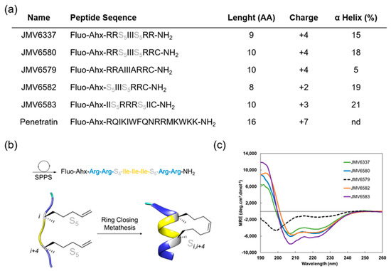 (a) Summary of fluorescent peptides used in this study. (b) Schematic representation of fluorescent stapled peptide synthesis by ring-closing metathesis (JMV6337), S5 corresponds to the (S)-pentenylalanine residue, (c) Overlay of far-UV circular dichroism (CD) spectra of stapled peptides. Experiment were performed at 20 °C in a water/TFE mixture (95/5).