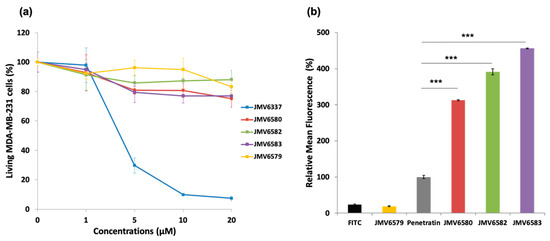 In a first instance, cell viability in the presence of stapled peptides was evaluated on human breast adenocarcinoma MDA-MB-231 cells for 72 h at different concentrations. Results showed that JMV6579, JMV6580, JMV6582, and JMV6583 had low cytotoxic effect up to 20 µM concentration, with cell viability values of 83 ± 5%, 75 ± 6%, 88 ± 6%, and 77 ± 2%, respectively (Figure 2a). In contrast, JMV6337 exhibited higher cytotoxicity at 5 µM with a cell death percentage value of 70 ± 5%. At higher concentration, we observed a drastic increase of cytotoxicity that reached 93 ± 2% of cell death at 20 µM.