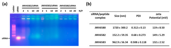 Studies of stapled peptides complexation with siRNA (a) Gel electrophoresis analysis for different stapled peptides at N/P = 2, 5, 10, and 20. (b) Physicochemical characterization (Particle size, polydispersity index (PDI) and ζ-potential measurements) of stapled peptide/siRNA complex at N/P = 2 for JMV6580 and JMV6583, and N/P = 5 for JMV6582. The values are represented as mean ± SD (n = 3).