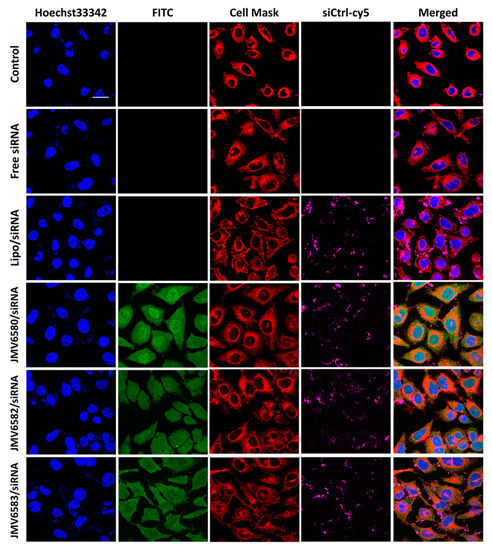 Cellular uptake of stapled peptides/siRNA complexes in HeLa cells visualized by fluorescence confocal microscopy. From the top to the bottom respectively: Untreated cells, cells incubated with 100 nM of siCtrl-cy5, cells incubated with the lipofectamine/siCtrl-cy5 complex at 50 nM, and finally cells incubated with the complex formed between stapled peptides (JMV6580, JMV6582 and JMV6583 respectively) and siCtrl-cy5 (100 nM) at N/P = 2 for JMV6580 and JMV6583, and N/P = 5 for JMV6582. The blue fluorescence indicates the nuclei, stapled peptides appear in green color, cell mask appears in red color, siCtrl-cy5 appears in magenta color. Scale bar = 20 μm.