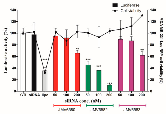 Luciferase activity assay showing the transfection of a 21-mer small interfering RNAs (siRNAs) targeting the expression of luciferase inside MDA-MB-231-Luc-RFP cells. The experiments were carried out with increasing amounts of siLuc (from 50 to 200 nM) complexed with the stapled peptides. The corresponding concentrations of the peptides are from 1.05 µM to 4.2 µM for JMV6580, from 1.4 µM to 5.6 µM for JMV6583 and from 5.25 µM to 21 µM for JMV6582. For lipofectamine transfection, the siRNA concentration used is 50 nM. In parallel, cell viability was measured for each condition. Results are expressed as mean ± standard deviation (n = 3). Statistically different, the level of significance was defined ** p < 0.01, and *** p < 0.001.