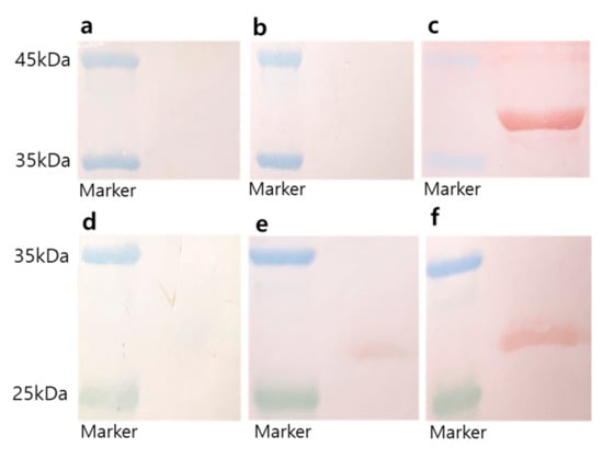Western blot analysis of serum samples from each group of immunized mice. (a–c) rVP1 (approximately 37 kDa) and (d–f) rVP3 protein (approximately 26 kDa)-blotted membranes treated with the diluted sera (1:100) obtained from mice immunized with (a,d) PBS (control), (b,e) m-peptide, and (c,f) m-PA. Red bands indicate rVP1 or rVP3 proteins that reacted with the serum. Blue bands are markers for 45 and 35 kDa, while green bands are the marker for 25 kDa.
