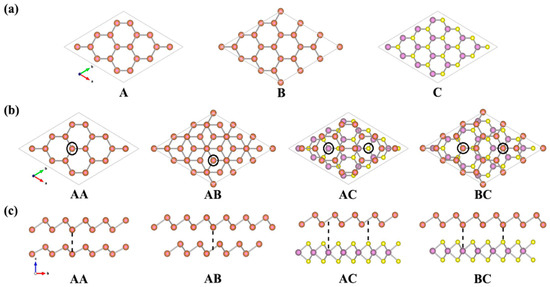 First-principles calculations were performed using the projector augmented wave (PAW) method within the density functional theory (DFT) [40] as implemented in the Vienna ab initio simulation package (VASP) [41,42]. The generalized gradient approximation (GGA) was used to deal with the electron interaction correlation potential [43]. In addition, in order to better explain the weak van der Waals interactions, which is crucial for layered heterostructures, all calculations in this work were performed using the PBE-D2 method [44,45]. In order to avoid the corresponding interlayer coupling, a vacuum layer of 15 Å in the z direction was set between two adjacent hetero-bilayers. The Brillouin zone integrations were approximated using the special K-point sampling of the Monkhorst–Pack scheme [46,47] with a Γ-centered 15 × 15 × 1 grid. Wave functions were expanded in plane waves up to a kinetic energy cutoff of 500 eV. The cell parameters and the atomic coordinates of all layered heterostructures are fully relaxed until the change of the energy and the force reaches 10−5 eV per supercell and 10−2 eV/Å, respectively. Although spin-polarized calculations were performed, the results indicated that all the layered heterostructures do not exhibit magnetism at their equilibrium states.