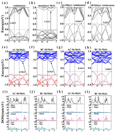 Band structures of (a) antimonene, (b) MoS2 monolayer, (c) AA bilayer antimonene, (d) AB bilayer antimonene, (e) AC Sb/MoS2 hetero-bilayer, (f) BC Sb/MoS2 hetero-bilayer, (g) AC Sb/MoS2 superlattice and (h) BC Sb/MoS2 superlattice. The density of states of (i) AC Sb/MoS2 hetero-bilayer, (j) BC Sb/MoS2 hetero-bilayer, (k) AC Sb/MoS2 superlattice and (l) BC Sb/MoS2 superlattice. The black dotted line indicates the Fermi level.