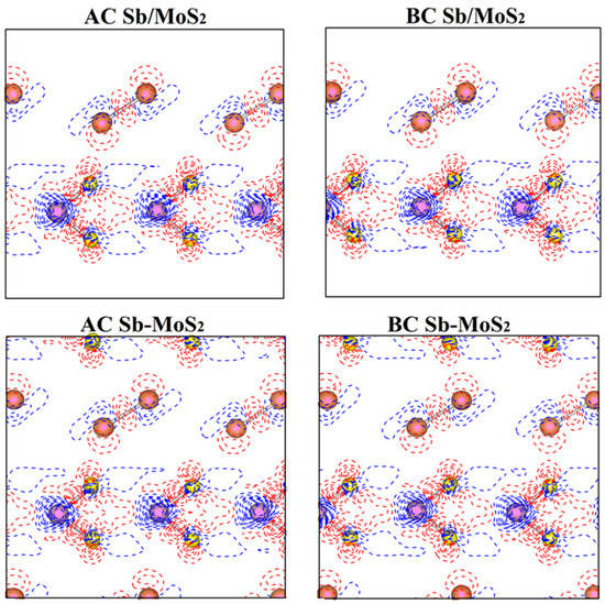 Deformation charge density ( for hybrid systems of planes perpendicular to the atomic layers and passing through Mo-S and Sb-Sb bonds. The red solid line and the blue dashed line indicate < 0 and < 0, respectively.