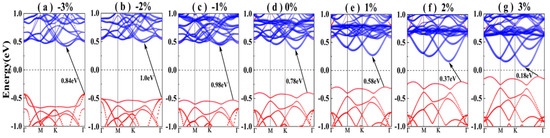 where a and a0 are the strained and unstrained lattice constants, respectively. The electronic band structures of the Sb/ MoS2 hetero-bilayer under different strains are shown in Figure 4, in which the band contribution from the antimonene and MoS2 monolayer are shown with blue and red dots, respectively. The band structure of the unstrained Sb/MoS2 hetero-bilayer is also depicted in the middle of Figure 4 for comparison. For Sb/MoS2 hetero-bilayers, the compressed (less than −8%) or stretched (less than 4%) systems are still semiconductors with indirect band gaps. However, it can be seen that the value of band gaps can be varied by compressing or stretching the lattice constants (shown in Table 3). A maximum band gap of 1.00 eV appears at the Sb/MoS2 hetero-bilayer with a compressed strain of −2%. For stretched Sb/MoS2 hetero-bilayers, the magnitude of band gaps decreases monotonically with an increase in lattice parameters. The size of the strain-induced band gap of Sb/MoS2 hetero-bilayers is in the range of 0.10~1.00 eV. As the lattice constant is decreased, the band moves toward the deeper energy level. When a compressive strain of −8% is applied, the Sb/MoS2 hetero-bilayer is metallic. Hence, through compressing or stretching, the hetero-bilayers realize the transformation from a metal to an indirect band gap semiconductor.