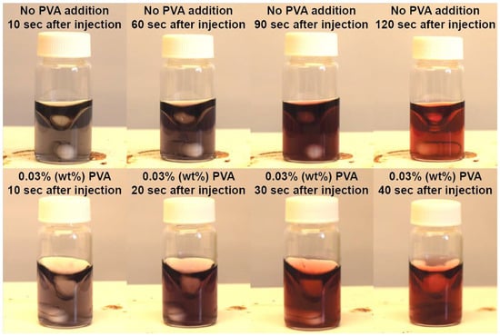 Images of GNP solutions with and without addition of PVA during the synthesis process at different time points after precursor injection (0.6 mM Au precursor, Ct/Au = 6).