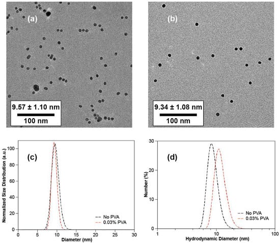 TEM images and size distribution plots of GNPs, 0.6 mM gold ions loading, Ct/Au = 6: (a) TEM image of GNPs with no PVA added; (b) TEM image of GNPs with 0.03% PVA added during the synthesis; (c) physical size distribution of GNPs in Figure 2a,b analyzed from TEM images; (d) hydrodynamic diameter distribution of GNPs in Figure 2a,c analyzed from DLS.