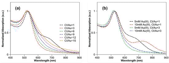 UV–vis spectra of gold colloidal suspensions: (a) 5 mM gold ions, Ct/Au varying from 1 to 15; (b) with variable of gold loading under the controls of Ct/Au = 1 and of Ct/Au = 3.