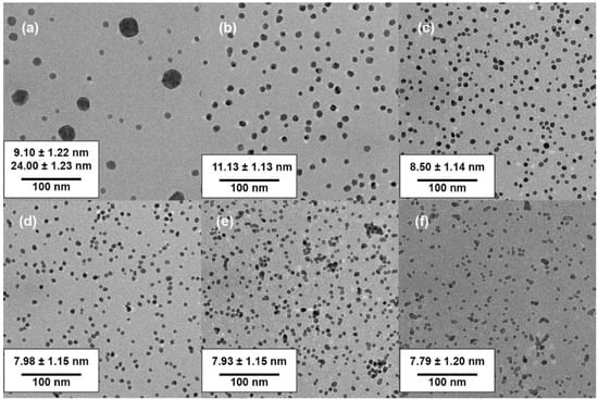 Transmission electron microscopy (TEM) characterization provided more direct data for the effect of citrate concentration on particle sizes (Figure 4) and size distribution of GNPs can be analyzed as followed (Figure 5). For a citrate concentration of 5 mM (Ct/Au = 1), GNPs of two different populations were observed in TEM imaging, with mean sizes of 9.10 ± 1.22 nm and 24.00 ± 1.23 nm, respectively (Figure 4a). This matches the bimodal spectra shown in Figure 3. A bimodal distribution occurs under these conditions due to the slow reaction caused by low Ct, causing a secondary nucleation to occur. Upon increasing Ct/Au to 3 (Figure 4b), monodisperse GNPs were synthesized with a mean diameter of 11.13 ± 1.13 nm and a narrow size distribution. This also correlates with the trends in the spectra as the bimodal spectra transitions into a sharp spectrum with a single peak. On further increasing Ct/Au from 3 to 15, the mean diameter decreased from 11.13 ± 1.13 nm to 7.79 ± 1.20 nm, but further increase led to aggregation (Figure 4b–f). When Ct/Au reached more than 12 (Figure 4e,f), more clusters were observed from TEM characterization. These results from TEM analysis match the hypothesis and results from LSPR spectra that increasing citrate leads to smaller particles due to stabilization but eventually the screening of electrostatic interactions dominates. From the collective results, we hypothesize that increasing Ct concentration beyond a critical value reduces stability because of the increasing ionic strength of the solution that leads to shielding of the electrostatic interactions. Thus, an initial increase in Ct concentration leads to smaller particle sizes due to the stabilization effect but eventually the adsorption of citrate on ions is not enough to overcome the decreasing repulsive interactions due to the increasing ionic strength.