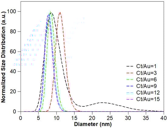 Normalized size distribution of GNPs with increasing Ct/Au (5 mM gold ions, 0.5% PVA).