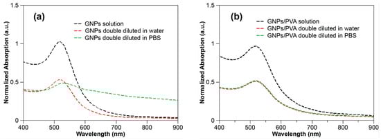 Based on the above results, it can be concluded that the GNPs without PVA aggregate when Debye length becomes smaller than approximately 2 nm, while those with PVA do not aggregate until the Debye length becomes less than approximately 1 nm. To further test this conclusion, we diluted GNP formulations with and without PVA with 1 × PBS. The Debye length of 1× PBS is 0.76 nm, so the Debye length after 1:1 dilution of the GNP sample will be approximately 1 nm, which suggests that the formulation without PVA should be destabilized while the one with PVA should remain stable. Control experiments were conducted by diluting 1:1 with DI water as well, which does not impact the Debye length. UV–vis spectra of both formulations before and after addition of PBS (Figure 7) show that the plasmon band became wider only for PBS dilution of the sample without PVA (Figure 7a) where the sample with PVA remained stable (Figure 7b). This confirms that only the sample without PVA aggregated with the smaller Debye length caused by PBS dilution, and the sample with PVA remained stable. These results show that Debye length plays a role in particle stabilization and that PVA can help to increase particle stabilization through its effect on Debye length. A previous study also showed that Debye length influences the color of the GNP solution [42]. Interestingly, it has been previously shown in the literature that the Debye length plays an important role for behavior of poly (methyl methacrylate) particles and plays a role in determining the density of GNPs deposited on template structures in UV nanoimprint lithography as well [43,44].