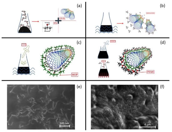 Schematics of CNTs/PDMS hybrid nanocomposite fabrication. (a) Detachment and dispersion of aggregated CNT bundles in IPA and (b) ultrasonication, (c) wrapping of IPA attached CNTs by MEP, (d) attachment of PDMS-A to MEP and evaporation of IPA by heating. SEM images of CNTs/PDMS nanocomposite (e,f).