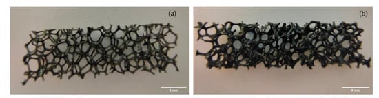 Conventional and auxetic cube-shaped samples were obtained from PU sponges. Samples of 30 × 10 × 5 mm were obtained by laser cutting and the conductive coating of the PU sponge was evaluated. The sponge functionalization technique was pursued by soaking the sample inside the non-cured CNT/MEP/PDMS mixture for about 30 s. A gentle force was applied by hand while soaking in order to distribute the ink and remove the air inside the holes. Once the soaking finished, the pores of the sponge seemed to be completely filled with mixture, so the pores were opened again with a gentle nitrogen flux and the sample was cured at 80 °C. This process is the building block to obtaining a thin conductive surface layer on the porous PU (see Figure 2).