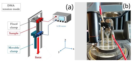 Impedance measurements were carried out with a high precision LCR meter (Keysight E4980A/AL, USA). Tensile strain experiments were carried out with a Dynamic Mechanical Analyzer (DMA Q800, TA Instruments, USA). The combination of the two tools allowed us to perform the experiment with a fine control of the strain in a quasi-static configuration and measure the electrical parameters. In more detail, the DMA was configured in tension mode, in order to control the applied strain, while LCR meter was active, allowing us to simultaneously measure the behavior of electrical resistance (see Figure 3). To monitor the electrical resistance, a high precision multimeter (ISO-TECH-IDM91E) was used. To avoid issues during electrical measurements due to the placement of crocodile clips directly onto the electrode, stretchable conductive fabric was exploited and attached to the electrode through a CNT/MEP/PDMS mixture.