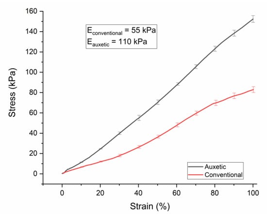 For 4 cm diameter conventional and auxetic PU sponges (20 PPI), Young moduli values were measured as 19 and 87 kPa, respectively (see Table 2). After coating with the CNT/PDMS composite, the thickness of the ribs increased, enhancing the values of elastic moduli to 55 kPa for the conventional coated sponge and 110 kPa for the auxetic one (see Figure 4). It is noteworthy that auxetic sponges result as stiffer. We think this is due to the modification of the structure by thermal treatment, although further studies to better assess this feature will be the subject of a forthcoming paper. At strain higher than 30%, the stress–strain curve shows no perfect linear behavior. Therefore, the Young modulus is computed in the linear region of this curve.