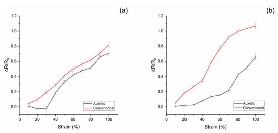 However, for the auxetic sponge, there is an initial plateau due to the geometric properties of the structure. In fact, the auxetic PU sponge involves the re-entrant structure of cells: when the initial strain is applied, the cell walls, under mechanical stress, return to the standard configuration of the conventional sponge with no expected change to the thickness of the CNT/PDMS coating. From this threshold (strain ~30%), the sample exhibits the conventional behavior, and increasing the strain will cause an increase in the electrical resistance due to the change in the stretched coating [42,43]. In order to define how much the sponge electrode resistance changes with the strain, for both functionalized sponges, conventional and auxetic, the relative change in electrical resistance ΔR/R0 to the mechanical nominal strain ε can be measured. This is the slope of the linear region in Figure 4 multiplied by 100. For both auxetic electrodes (2 and 2.5 wt%), it is on average 0.97. In the case of conventional electrodes, for 2 wt%, the slope is 0.87; for the electrode at 2.5 wt%, it is 1.25. In contrast, the auxetic sponge is insensitive to strain of up to 30% in its plateau region. This result suggests an auxetic PU sponge electrode can be exploited in a flexible or wearable sensor without affecting its electric behavior at up to 30% strain. It can be assumed that CNTs’ conductive path could break with the stretching of the structure at strains higher than 30%. In the future, further tests will be performed to study the ageing of the electrode upon multiple stress–strain cycles.