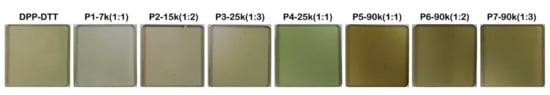 In Figure 1, the photographs of the investigated samples reveal that the surface of the substrates was uniformly and completely coated by the organic thin films deposited by MAPLE. The label of the samples based on DPP-DTT:C60 blends (P1–P7) contains the number of laser pulses used during the MAPLE deposition (7 k, 25 k or 90 k) and the DPP:C60 weight ratio (1:1, 1:2 or 1:3) in the MAPLE target, with the DPP-DTT layer being deposited at 25 k laser pulses.