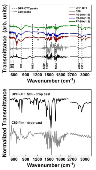 FTIR spectra of the thin films deposited by MAPLE on silicon and of the single components (DPP-DTT and C60) obtained by drop casting. * Peaks attributed to chloroform.