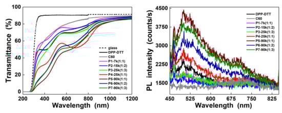 Further, the optical properties of the thin films based on the DPP-DTT:C60 blends deposited by MAPLE were investigated by UV-VIS spectroscopy and photoluminescence. Thus, regardless of the weight ratio between the two organic components and the number of laser pulses involved in their MAPLE deposition, the UV-VIS spectra (Figure 3 left) and PL spectra (Figure 3 right) of the thin films based on DPP-DTT:C60 blends are dominated by the absorption attributed to the DPP-DTT in the visible range and by a broad weak emission band with a maximum at ~525 nm, respectively. The shape of the UV-VIS absorption spectrum of DPP-DTT, with two minima at ~420 and ~670 nm, is similar to that reported for the films based on this conjugated polymer with a low molecular weight deposited by spin-coating from chloroform [13,14,21,46]. Thus, the two absorption bands, one less intense between 360 and 500 nm and the other more intense between 500 and 1000 nm, are associated with the π-π* transitions and the ICT transition from the DTT unit to the DPP unit, respectively [47]. Additionally, in the UV-VIS spectrum of the DPP-DTT film deposited by MAPLE, a lower absorption can be noticed in comparison to the stronger absorption and sharper spectral features presented in the previous reports [13,14,25]. This outcome can be explained taking into account two aspects: the lower molecular weight of DPP-DTT, in agreement with the result reported in [25], and/or the lower concentration of the conjugated polymer (3% w/v) involved in the MAPLE process. Additionally, it can be mentioned that the increase in the weight ratio induces an attenuation effect in the two maxima absorption of the conjugated polymer. In the case of the other organic component, the UV-VIS spectrum of the C60 thin film deposited by MAPLE discloses a weak broad absorption band with a maximum at ~450 nm, specific to this compound [27].