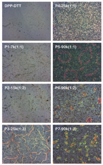 Optical images of the layers deposited by MAPLE on ITO/PEDOT:PSS (500×, 150 μm × 120 μm).