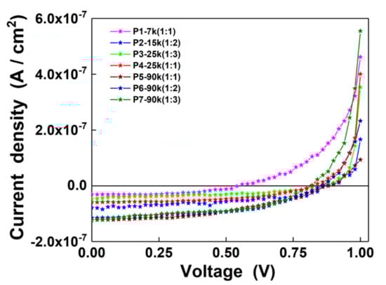 Generally, in the polymeric solar cells, the VOC value is linked to the offset between the HOMO level of the electron donor and the LUMO level of the electron acceptor [56]. Additionally, various studies report that the VOC value can be influenced by the donor/acceptor interface area, light intensity, defect state, crystallinity, morphology, etc. [56,57]. In the case of the VOC parameter, the structure based on P1 (the most thinner film) is featured by the lowest VOC, while, regardless of the DPP-DTT:C60 weight ratio and the thickness of the organic layers, a significant increase in the VOC value was achieved for the other samples when the number of laser pulses increased. A similar result concerning the minimal influence of the thickness of the organic layers on the VOC values is also evidenced for structures based on another conjugated polymer and fullerene-derivative compound, P3HT:PC71BM [58]. As regards the JSC parameter, excepting the structure based on P2, a gradual increase in this electrical parameter was recorded for P1 to P7 samples. Interesting, for all structures based on thicker films (P5–P7 samples), the JSC values are very close being higher than those of the structures involving the thinner films (P1–P4 samples). Several factors such as absorption properties, thickness layer, roughness can be responsible for this outcome. Thus, in the P3 film containing DPP-DTT:C60 in a 1:3 weight ratio, the small content of DPP-DTT and the thickness of the layer result in a weaker absorption which can be associated with a small number of excitons generated in the active layer. From the structures developed on P2 and P6 layers, deposited at different number of laser pulses but both containing DPP-DTT:C60 in 1:2 weight ratio, P2 sample exhibit the best electrical parameters (Pmax) from the thinner films, while the P6 sample presents the best device parameters from the all investigated samples. A similar outcome was observed in the case of thin films based on P3HT:C60 blends deposited by MAPLE using the same weight ratio [27]. Consequently, the addition of C60 can favor the formation of a larger interface between the conjugates polymer and fullerene. A higher increase in the C60 amount enlarges this interface and in the same time, also increases the layer thickness and its roughness affecting the charge carrier transport. Regarding the FF parameter, all investigated samples presents similar values ranging between 0.42 and 0.54, the highest value being obtained in the case of P1 sample (the most thinner film featured by a reduced roughness). The result can be explained taking into account that in the organic solar cell, the FF value is related to the mobility of the carriers, the thickness of the active layer and the morphology of the interfaces [59]. Previously studies shown that a high roughness and a low molecular weight of the DPP-DTT can decrease the electron and hole mobilities, leading to poor device performance, while a high concentration of the conjugated polymer featured also a high molecular weight results in films with adequate electrical properties [14,16,25]. Although the values of the electrical parameters of the developed structures were smaller in comparison with those of the films based on DPP-DTT and the fullerene derivative compounds deposited by spin-coating [14,25,26], they can be improved by modifying the MAPLE process parameters. Hence, by increasing the concentration of the conjugated polymer in the deposition target and by changing the number of the laser pulses, frequency, etc., the absorption properties of the active layers can be improved and their surface roughness can be reduced.