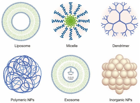 Micelles are nanoscale amphiphilic structures that have a hydrophobic core and a hydrophilic shell with the size ranging from 5 to 100 nm [76]. The size of the micelle varies depending on the properties of the amphiphile and drug entrapment. The micelle can carry hydrophobic drugs within its core while its shell binds hydrophilic drugs. A critical micelle concentration (CMC), a key parameter for micelles, is the minimal amphiphile concentration for micelle formation. The self-assembled structures occur as soon as the concentration of amphiphile in the aqueous solution reaches the CMC [77]. Micelles can also be preferentially uptaken by conjugating with peptides, antibodies, or other targeting ligands [78]. Among the different kinds of micelles, polymeric micelles are most widely used in drug delivery systems [79]. They are made up of block-copolymers consisting of hydrophilic and hydrophobic chains. Due to the low CMC, polymeric micelles remain more stable and possess a longer circulation time when compared with other micelles [80].