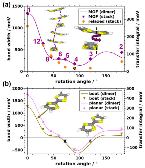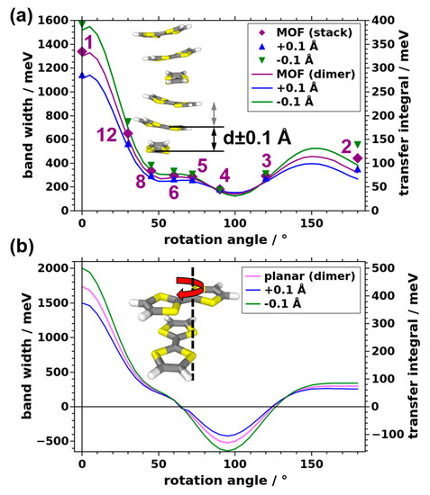 Evolution of the valence bandwidth and the transfer integral with the rotation angle as a function of the stacking distance. (a) Results obtained for TTF stacks and corresponding dimers based on the MOF geometry. (b) Dimer results based on the planar TTF conformation.