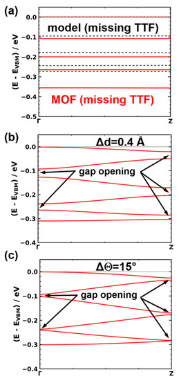 An analysis of the contributions of the different parts of the MOF to the valence and conduction bands suggests that especially hole transport (which is particularly relevant for TTF-based systems; see above) should be described well by the model TTF stack. This notion is confirmed by the comparison of the valence band structure of the actual Zn2(TTFTB) MOF (solid line) and the band structure of the model TTF stack in Figure 2b; qualitatively, the two band structures are the same. The only apparent difference is a somewhat smaller bandwidth of 303 meV in the model system (which amounts to ~82% of the bandwidth of the actual MOF). This leads to a comparably small change in the effective mass at the valence band maximum (VBM) from 2.05 to 2.40 me (with me being the mass of a free electron). We attribute this difference to the overlap of the π-orbitals of neighboring phenylenes in the H4TTFTB linkers in the actual MOF, which is not captured by the model system (see systems TTF and TTFTB in Table 1 and further details in the Supplementary Materials). These quantitative differences are, however, rather small compared to the effects discussed below, rendering the TTF stack a useful model system.