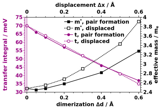 The missing linker defect has the most dramatic impact. It results in essentially flat bands (see Figure 7a), the minimum transfer integral drops to 1 meV, and the effective mass skyrockets to 22 me. This shows that such a defect nearly stops charge transport along the affected TTF stack. As shown in Figure 8, also pair formation and displaced molecule defects result in an increased effective mass and a decreased transfer integral (with the exception of a minor decrease in m* for a very small dimerization of Δd = 0.05 Å, which is in the range of the uncertainty of the fitting procedure). The magnitude of the change increases with increasing displacement. Additional data on the impact of the other defects can be found in the Supplementary Materials. As a consequence, charge transport is hindered within defective TTF stacks. Interestingly, for pair formation as well as for the displaced molecule defect, the minimum transfer integral decreases almost linearly with the displacement, while the effective mass experiences a roughly quadratic increase. The latter is more pronounced in the displaced molecule case. The overall impact of these defects is, however, rather moderate (especially compared to the missing-linker case). For example, a lateral displacement of a TTF molecule by a rather sizable distance of Δx = 0.3 Å leads to an increase in m* by a moderate 0.42 me (or 17%).