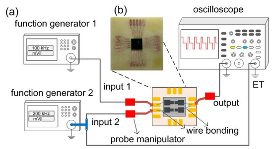 (a) Experimental setup using two function generators as the two inputs on the two FEAC devices. The other two electrodes of the FEAC devices are merged as the output that connects to an oscilloscope. A chip is mounted on a printed circuit board, and the probe manipulators connect the FEAC devices and the instruments. One of the inputs is connected to the oscillator’s external trigger (ET) to synchronize the output with the input signal. (b) Photo of the FEAC devices mounted on a printed circuit board.