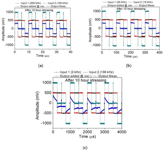The voltage adder of reliability of post-test after 10-h electric current stressing. The output measurement (blue), added inputs (gray), and two square wave inputs (black and red) with distinct frequencies of (a) 200 and 100 kHz, (b) 200 and 100 kHz, and (c) 2 and 1 kHz compared to pre-test in Figure 4.