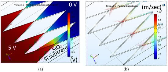 Finite element analysis used COMSOL (5.2, COMSOL Inc., Stockholm, Sweden) to model particle trajectories, potential, and electric field distributions. Particle trajectories and potential distributions used 3D modeling that included an asymmetric field emission device with a thickness of 100 nm on a 15-nm-thick SiO2 film. The thickness of the silicon substrate (725 µm) was trimmed to fit a device’s frame. The boundary condition was to apply 5 V on one electrode surface and ground the other (0 V). A hidden box filled with air enclosed the whole device. The separate two layers of 100-nm-thick tantalum on the cathode and anode were for modeling purposes. The lower tantalum film was for performing electron trajectories, and the upper was for applying an electric potential. A 15-nm-thick SiO2 thin film was between the electrodes and the silicon substrate. The thickness of a silicon substrate had to be reduced because the silicon substrate was too thick (725 µm) to fit into the modeling frame. The boundary condition was electric potentials of 5 and 0 V (ground) on the two electrodes. A cuboidal box filled with air enclosed the entire device.