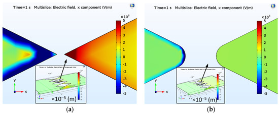 The geometric tips serving as electron emission would also influence the local electric field distribution. Figure 11a,b demonstrates electric field distribution along the x-axis (EX) with respective sharp and blunt tips, enlarged from the modeled FEAC devices in the insets of Figure 10a,b. It only compares two devices’ EX because the thicknesses (y-axis) and angles (related to the z-axis) of the two figures’ triangular tips are the same. The simulation shows that the sharp tip exhibits a significant EX difference at the tip-gap-tip than the blunt one. The result implies that pointed apices are a required design to enhance the electric field at the tip-gap-tip, which agrees that the rough surface usually possesses a high enhancement factor [32,33].