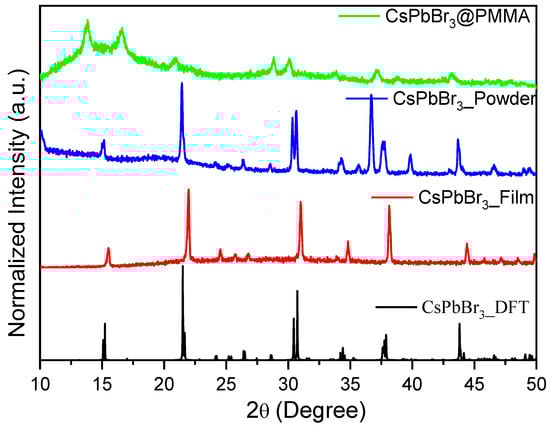 The CsPbBr3 perovskite was prepared by a mechanical route that yielded perovskite particles in powder form. The X-ray diffraction (XRD) spectra of the synthesized perovskite particles are presented in Figure 1. This figure compares the X-ray diffraction patterns of CsPbBr3 simulated by density functional theory (DFT), the CsPbBr3 thin film formed in the thermal evaporation system, grounded CsPbBr3 powder, and the CsPbBr3/PMMA thin disk. The simulated XRD patterns were calculated in VESTA software using the lattice parameters with a Pnma space group, which describes the orthorhombic structure of CsPbBr3 perovskite at room temperature with a size of several hundred nanometers [32,33,34,35,36,37,38,39,40,41]. The XRD peaks of the perovskite particles prepared by the mechanical route closely matched those of CsPbBr3 perovskite thin-film material formed by a different synthesis method (namely, by thermal evaporation).