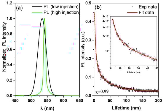 Figure 4 displays the steady-state PL spectra (black curve), the ASE spectrum (green curve), and the time-resolved PL of the CsPbBr3 thin disk. From these data, we can investigate the radiative recombination behavior, PL dynamics, and the defect healing effect in the sample. Figure 4a shows the normalized PL spectra in the low and high injection cases. The FWHM of the emissions decreased from 16.37 nm at low injection (spontaneous emission) to 7.88 nm at high injection (stimulated emission). The PL peak of the CsPbBr3/polymer thin disk (at 534 nm) was slightly redshifted from that of pure CsPbBr3 (at 520 nm). The redshift can be attributed to the aggregation of perovskite particles, which facilitates non-radiative recombination.