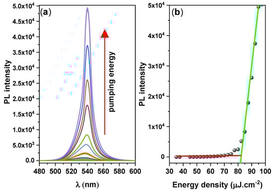 The onset of stimulated emission in the CsPbBr3/PMMA thin disk manifested as an immediate increase in the ASE intensity and a narrowing of the emission spectrum (FWHM ≈ 10 nm) over the threshold pumping range. The ASE generated at 537 nm shifted to 541 nm. The ASE peak (4 nm) was redshifted from the PL peak, as shown in Figure 6. However, when the pump energy increases above the ASE threshold, a redshifted peak has multiple causes, such as thermal effects, defect transitions [53], and band gap renormalization in the highly excited perovskite crystal [54], whereby the band gap is redshifted by hole–electron interactions under high population conditions. Moreover, as suggested by the re-absorption effect arising from the overlap of the absorption band edge with the PL emission (spontaneous emission spectrum) (Figure 2), the self-absorption effect should contribute to the ASE state [55].