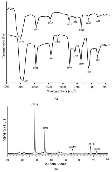 (A) The FTIR spectrum of the A. tribuloides root extract and the greenly synthesized AgNPs. (B) The XRD pattern of the AgNPs produced by using the A. tribuloides root extract.