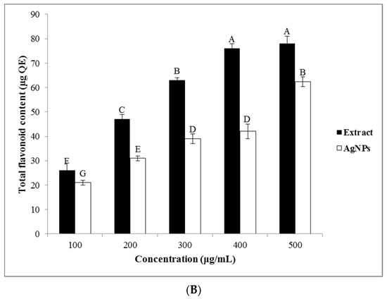 The phenolic and flavonoid compounds are important secondary metabolites of plants for the bioreduction of the Ag (I) ions, and their amount in the plant extract can affect the reaction kinetic, shape, and size of the greenly synthesized NPs. The results showed that the TPC and the TFC of the A. tribuloides root extract and the greenly synthesized AgNPs were increased with their increasing concentration (Figure 4A,B). The analysis showed that the A. tribuloides root extract contained 163.2 ± 2 μg GAE of the TPC and 78.1 ± 3 μg QE of TFC at the highest concentration of the extract (500 μg/mL). The TPC and the TFC of the same concentration of the AgNPs were 106.4 ± 1 μg GAE and 62.4 ± 2 μg QE, respectively. The presence of these compounds on the synthesized AgNPs’ surface approved the role of the polyphenolic compounds as the reducing agents in the AgNPs production [40].