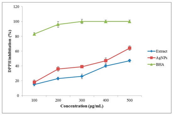 The free-radical scavenging activity of the A. tribuloides root extract and the greenly synthesized AgNPs was evaluated by using the DPPH radical scavenging method (Figure 5). According to the results, the DPPH scavenging activity of the extracts and the fabricated AgNPs increased with their increasing concentration. The inhibition percentage for the highest concentration (500 μg/mL) of the A. tribuloides root extract was 47%, while this amount for the greenly synthesized AgNPs was 64%. The highest antioxidant properties of the AgNPs in comparison to the extract were likely associated with the adsorption of the bioactive compounds over the spherically shaped AgNPs [41]. It could also be attributed to the concurrent activity of the polyphenols as the antioxidant compounds and the AgNPs as a catalyst agent [42].