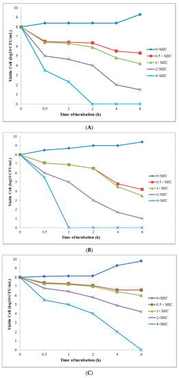 The time-kill test was based on the MIC values, found previously in the micro-broth dilution assay, and carried out using the procedure explained by Souza et al. [29], with slight modifications. The greenly synthesized AgNPs was diluted with the Müller–Hinton broth medium (containing 1.5 × 108 CFU/mL inoculum), to achieve their final concentrations of 0 × MIC, 0.5 × MIC, 1 × MIC, 2 × MIC, and 4 × MIC for each bacterial strain, and incubated at 37 °C. At various exposure-time intervals (0, 0.5, 1, 2, 4, and 6 h), 0.1 mL of the medium was serially diluted in a phosphate buffered saline (PBS) solution (1%) and plated onto the Müller–Hinton agar. The plates were incubated for 24 h, at 37 °C. The results are presented in the log10 CFU/mL scale.